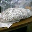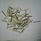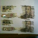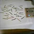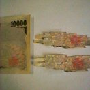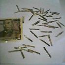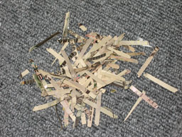 こんな感じ.一万円札2枚が見事にバラバラに…3mm×25mm の短冊に なってしまいました. 一万円紙幣が一枚 160mm×76mm なので,2万円で計334片あまりに 分割されてしまいました. 取りあえず色がちがってそうなものを取り出したところ.
