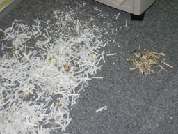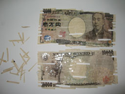 出張を終え,数週間は空いた時間に短冊を拾い集める日々. 幸い,それまでにしばらく漂白度の高い紙をスレッダに掛けていたので, 日本銀行券独特の色は目立ちました. また,二枚の一万円札はどうやら新札だったようで,さらに ぴったり重なっていたため, 同じ箇所が二枚重なった短冊を多く拾う事ができました. それと同時にネットで換金方法を検索しました.最初のうちは 券面の連続面積が1/3無いと一銭も返って来ない というような情報を読んでしまい,目眩を感じました. すると一方でシュレッダに紙幣をかけてしまうケースが最近多く, 日本銀行での対応が変わったとの情報も.ある掲示板では, 日銀で係員が数名出て来て復元作業をやってくれた上で全額返って来たとも. そこで,日銀に電話をかけて訊きました. (四国四県では高松の日銀支店だけがこのような事件を扱えるそうです.) さて,分かった事は以下です: